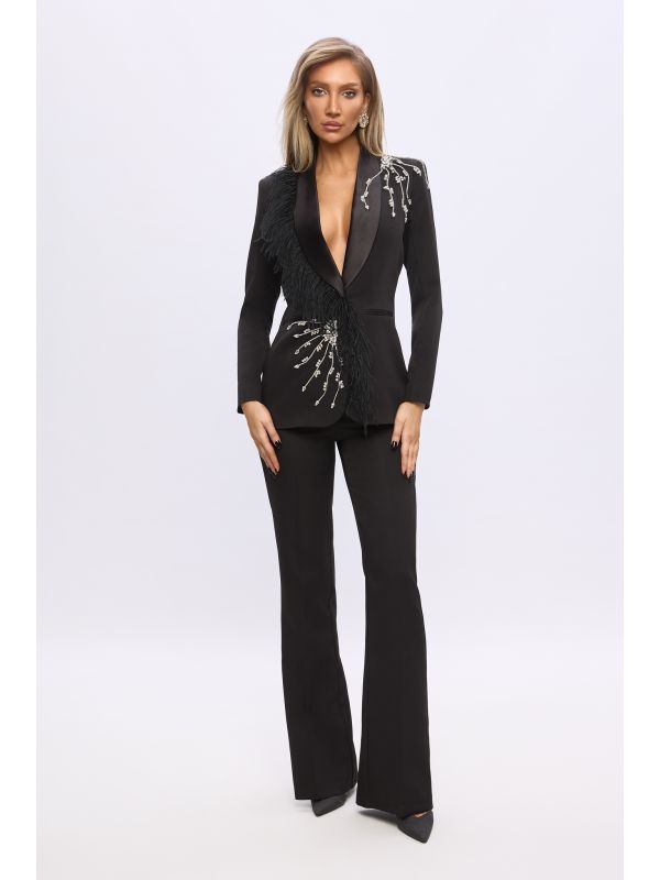 50. Costum negru din doua piese: sacou cu pene si pantaloni evazati BBY-CS36F