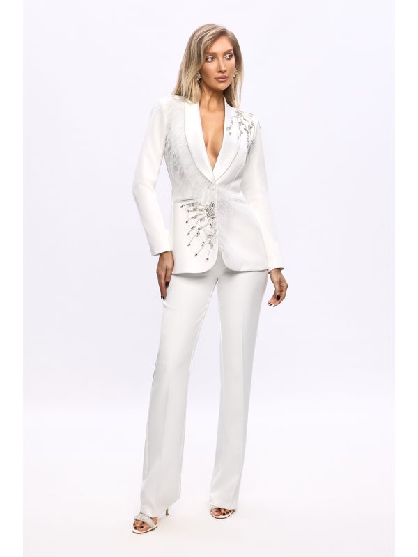 51. Costum alb din doua piese: sacou cu pene si pantaloni evazati BBY-CS36F