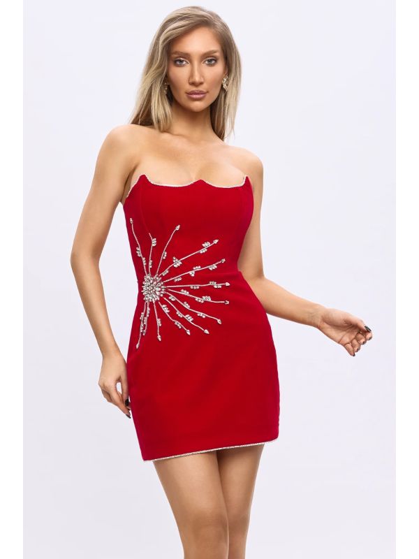 45. Rochie scurta din catifea rosie, accesorizata de cristale pretioase BBY-R93F