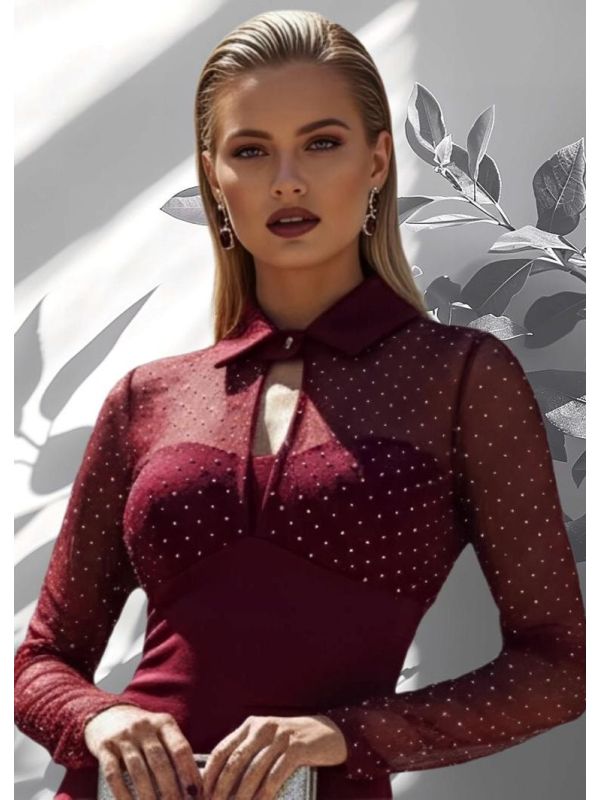 53. Bluză elegantă burgundy din tull transparent cu aplicații fine IT-BL77F