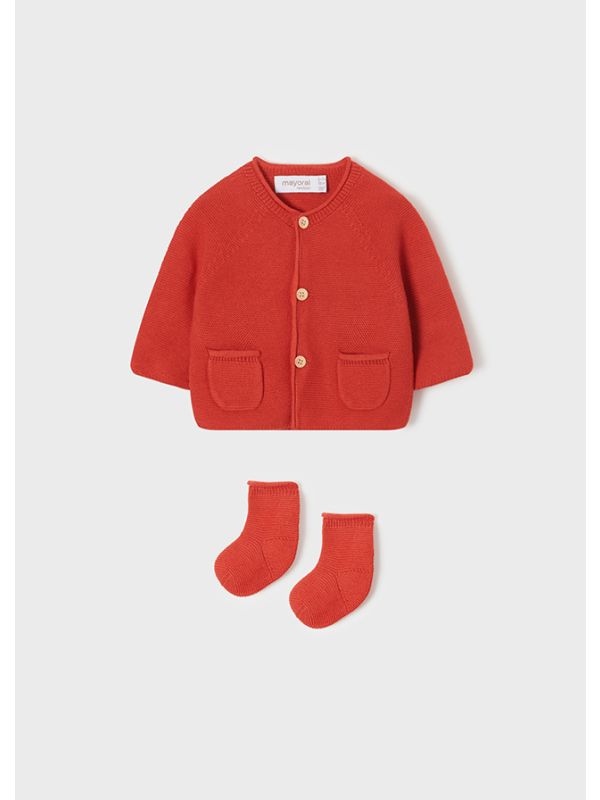 18. Cardigan rosu lung si sosete tricot ECOFRIENDS new born fata 1346 MY-CS01C