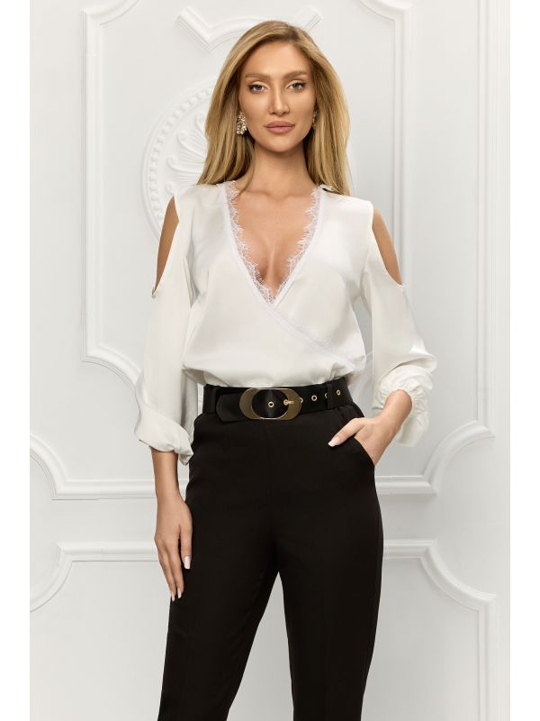 21. Bluza alba satinata cu decolteu in V, accesorizat cu dantela BBY-BL13A