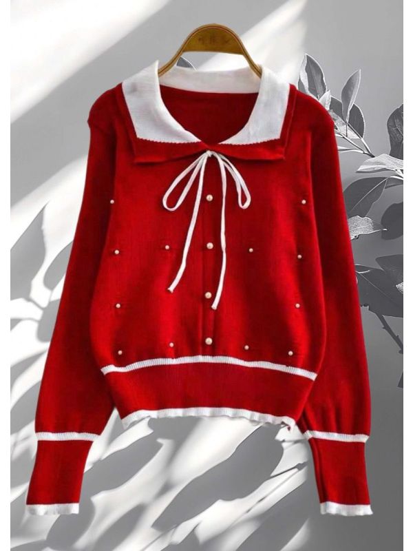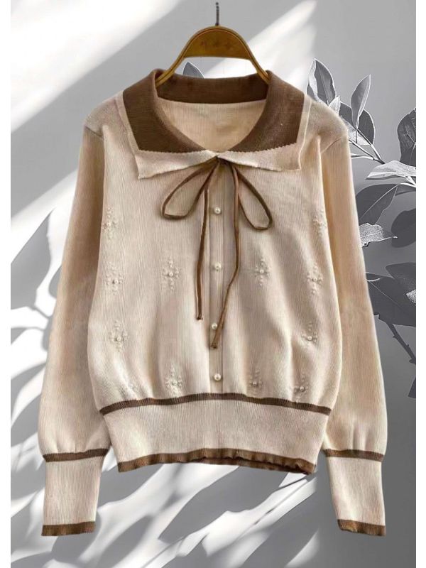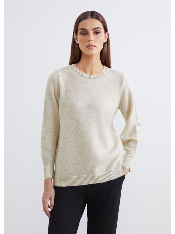 18. Pulover crem cu guler maro si margele IT-BL52F